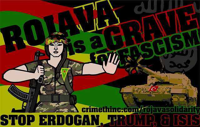 With nationalism growing worldwide, the Turkish invasion of Rojava for the purpose of ethnic cleansing and resettlement is the equivalent of late-1930s German expansionism. This poster honors the participation of the YPJ (Yekîneyên Parastina Jin, Women’s Defense Units) in the defense of Rojava.